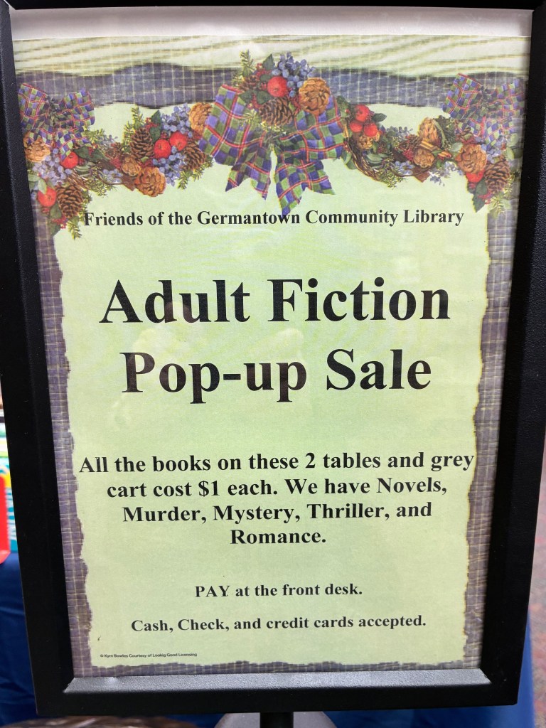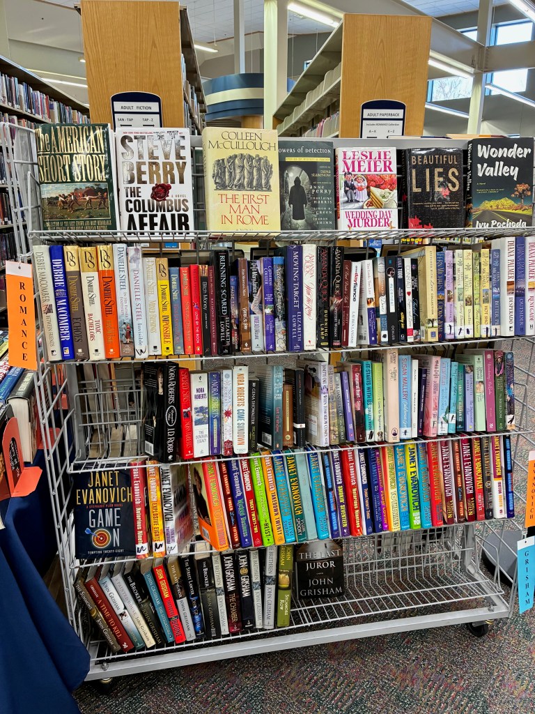 The February pop-up sale features adult fiction. There is a wide variety including novels, mystery, thriller, romance and more. All items on the table and gray cart are priced at $1.00 each. New items added frequently.
