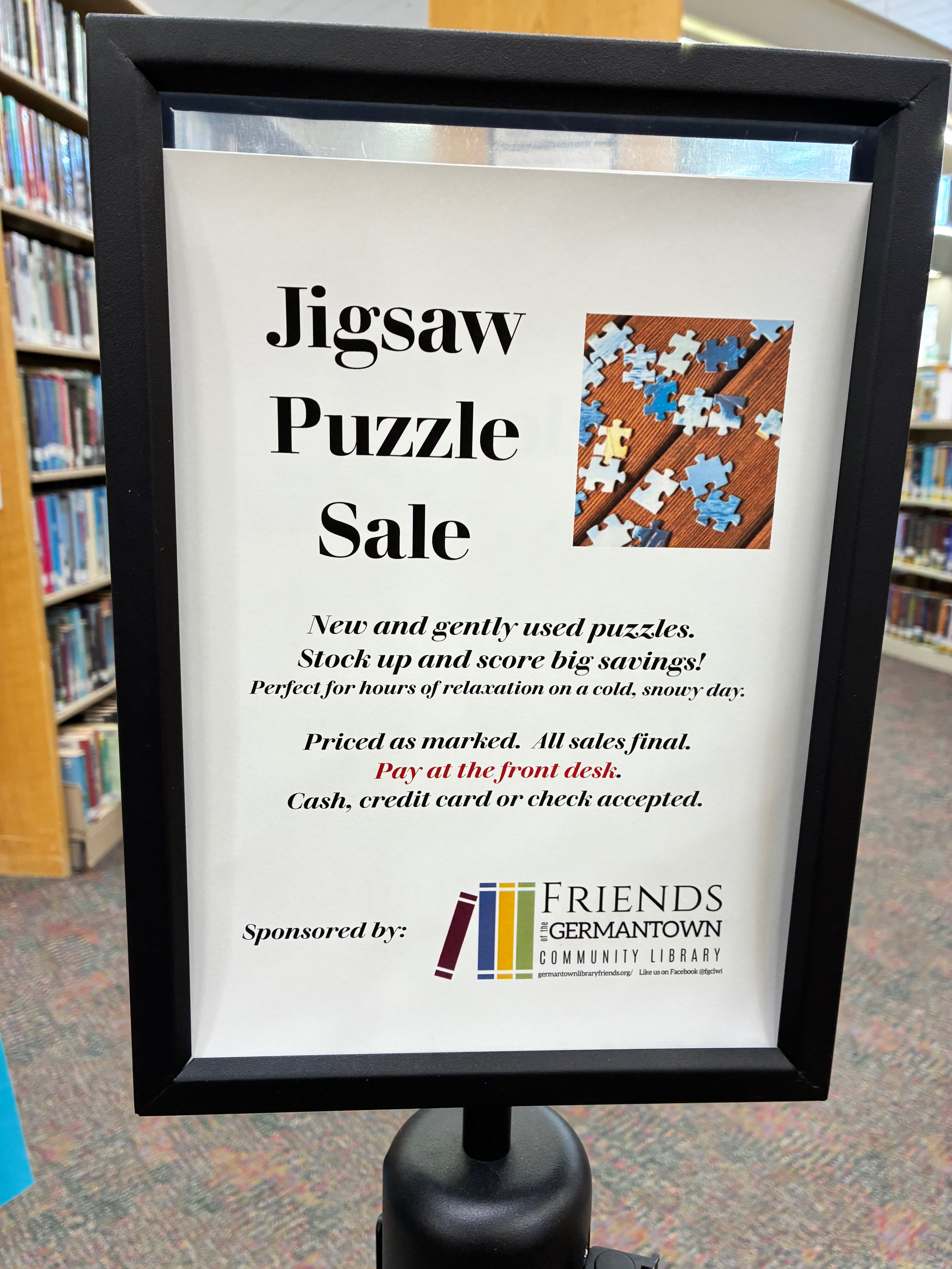 Back by popular demand: Our giant jigsaw puzzle sale! Help us raise money for additional quality programs for Library patrons. Over 200 puzzles to choose from, including large-piece formats. Quality brands, like White Mountain, Ravensburger, and more. These are perfect for hours of relaxation on a cold, snowy day.